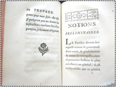 [p. 6] Quoiqu’il ait paru plusieurs Traités Militaires, j’ai cru devoir donner une idée plus exacte & moins compliquée des fonctions propres à un partisan. On remarquera que je me suis attaché à développer des méthodes qui, jusqu’alors, n’ont été expliquées & suivies que fort superficiellement.